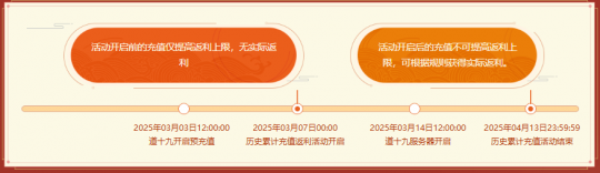 道友们在3月3日-3月6日23:59期间在新服道十九的预充值会被计入历史充值金额,提高返利上限,无实际返利。3月7日00:00-4月13日23:59:59活动开启后的充值不可提高返利上限,可根据规则获得实际返利。